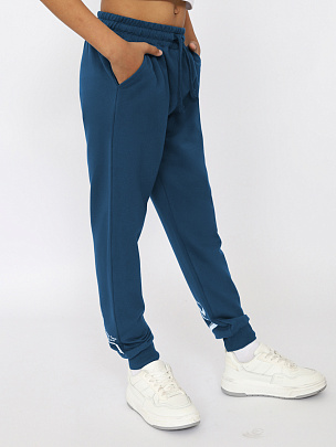 Брюки с притачным поясом и манжетами. Пояс из основного полотна и эластичной резинкой внутри. Низ брюк с притачными манжетами из полотна с добавлением лайкры. Задняя часть декорирована принтом "Реальный".