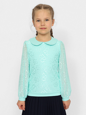 Джемпер свободного силуэта для девочки со спущенным плечом и длинными рукавами. Полочка декорированя кружевом. Воротник из основного полотна.